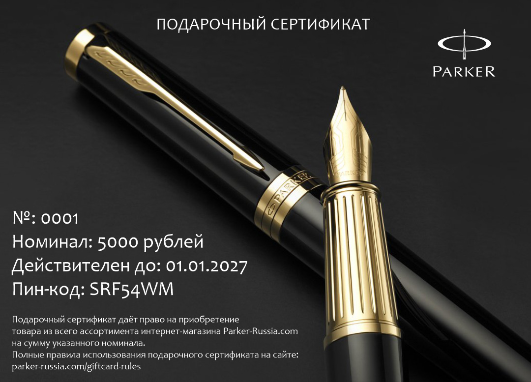 Подарочный сертификат Parker 15000 от официального дилера Parker в Пензе. Вы можете дополнительно заказать гравировку, которая подчеркнет Вашу оригинальность и придаст памятность статусному подарку. Все ручки Паркер поставляются в фирменном футляре.